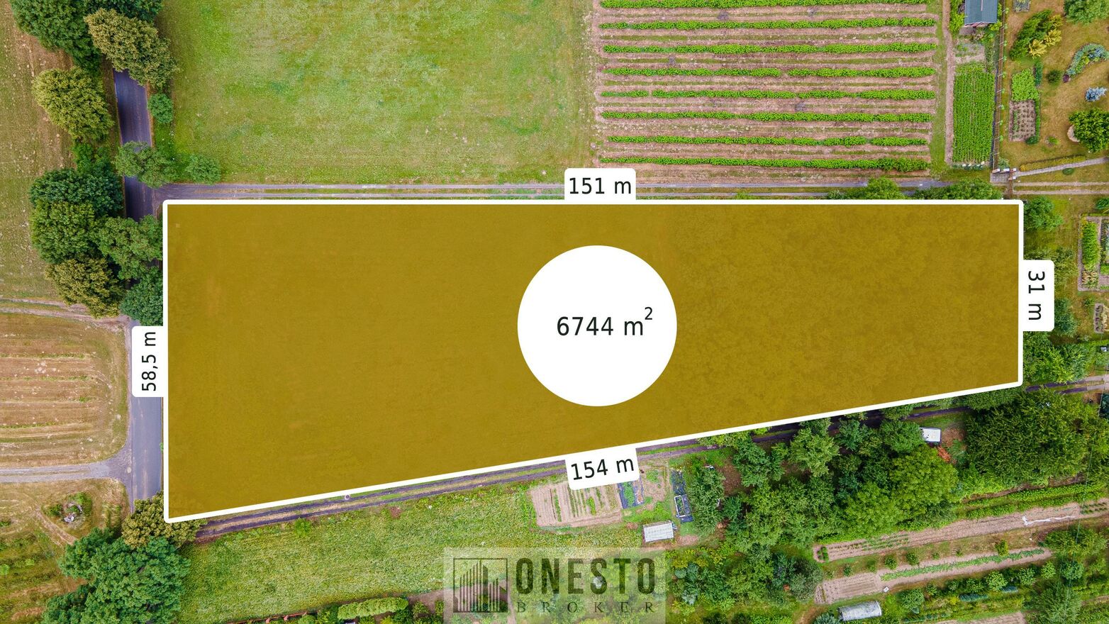 Nieruchomość w kształcie trapezu o wymiarach: szerokość od ulicy 58m, długość 154m. Działka o powierzchni 6700m2. Teren równy, niezabudowany, na części działki znajduje się zadrzewienie. Miejsce idealne pod inwestycje w idealnym miejscu, lokatę kapitału lub jako miejsce do zamieszkania.